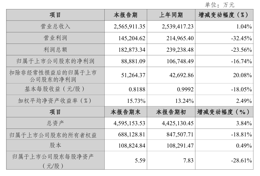 此外,营业利润较上年同期下降32.45%,主要系尿素、聚氯乙烯受市场波动影响,价格持续下跌,煤炭受市场供需关系影响,量价同比下跌。