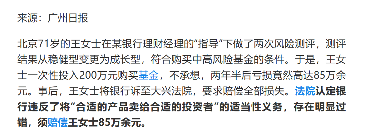 2026年“3·15”国际消费者权益保护日期间,中国消费者协会发布“2025年全国消费维权十大典型司法案例”,其中一起金融消费纠纷格外具有行业警示意义:65岁的王女士经兴业银行(601166)北京东外支行理财经理推介,分多次认购总计106万元代销基金,最终赎回时产生21.9万余元大额投资亏损,成为老年金融投资者权益保护的典型样本。