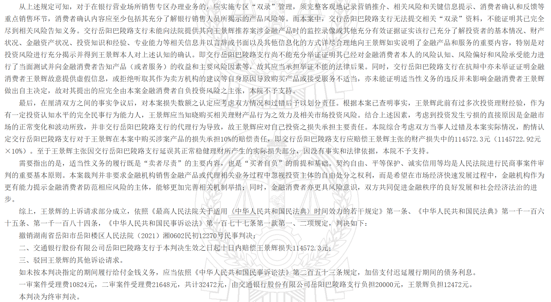 与之形成对比的是交通银行岳阳巴陵路支行一案,投资者王某辉认购1500万元中低风险理财产品,最终亏损约114.5万元。该案中产品风险等级本身偏低,银行仅因无法提供双录资料证明已履行风险告知义务,法院于2025年3月作出终审判决,判定银行承担10%的赔偿责任。