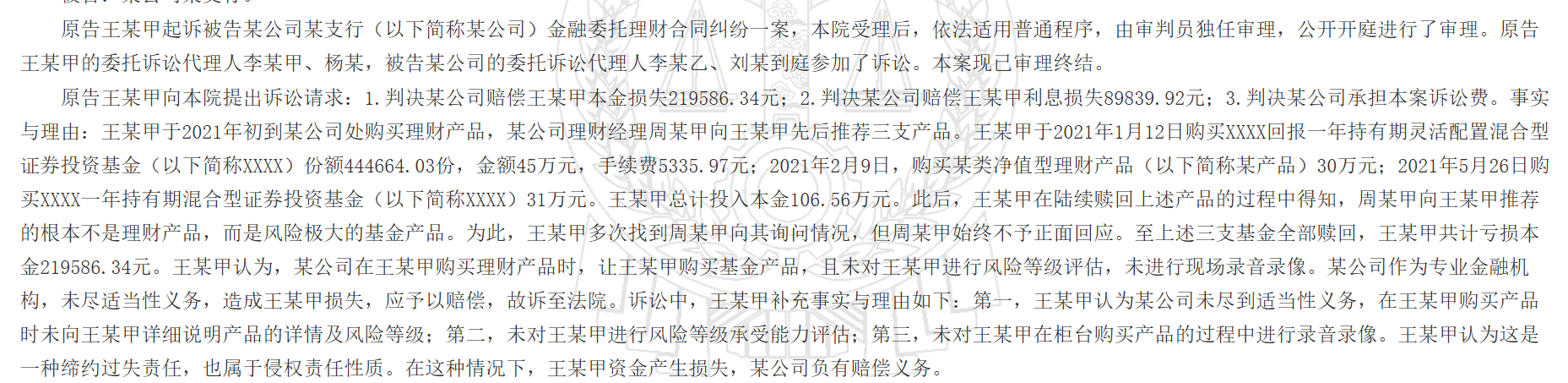 2023年金融市场波动加剧,涉案基金的潜在风险集中爆发,当年11月29日王女士分批赎回三只基金,扣除交易手续费后,实际本金亏损总额达21.96万元。细分来看,两只R4高风险基金分别亏损112886.1元、61610.1元,R3中风险基金亏损35607.2元,整体亏损幅度接近本金21%。对于依靠养老金生活、此前已被其他银行评定为风险承受能力受限的王女士而言,这笔亏损带来了沉重的经济与心理负担。
