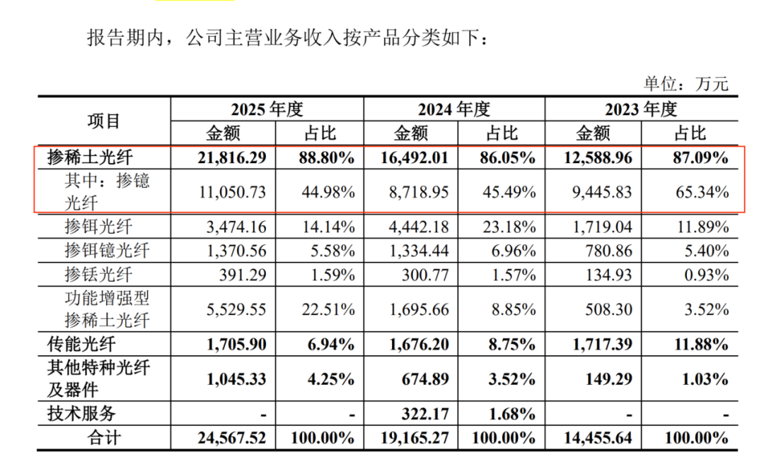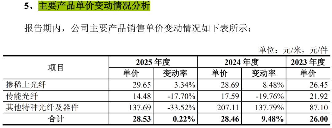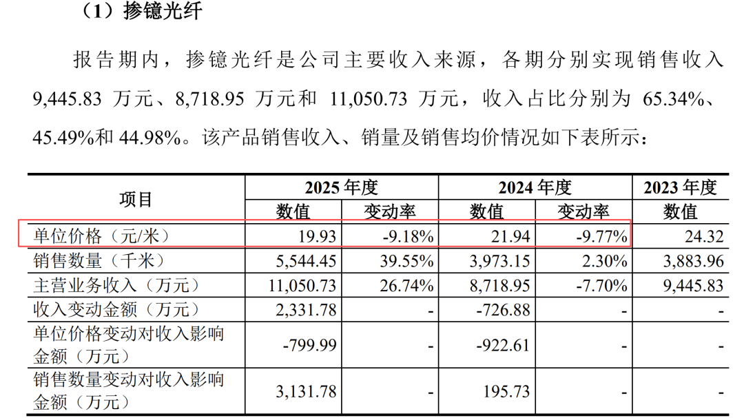 于报告期内(2023年至2025年),掺稀土光纤单价虽然整体保持增长,但其中每年贡献4成以上营收的核心产品掺镱光纤则出现了降价。