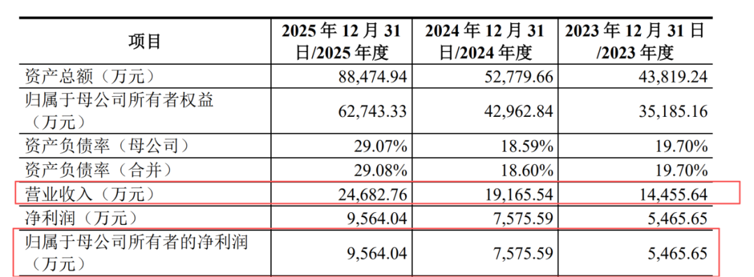 2023年至2025年,公司实现营收1.45亿元、1.92亿元及2.47亿元,增速分别为33.56%、32.58%及28.79%,一路下滑。