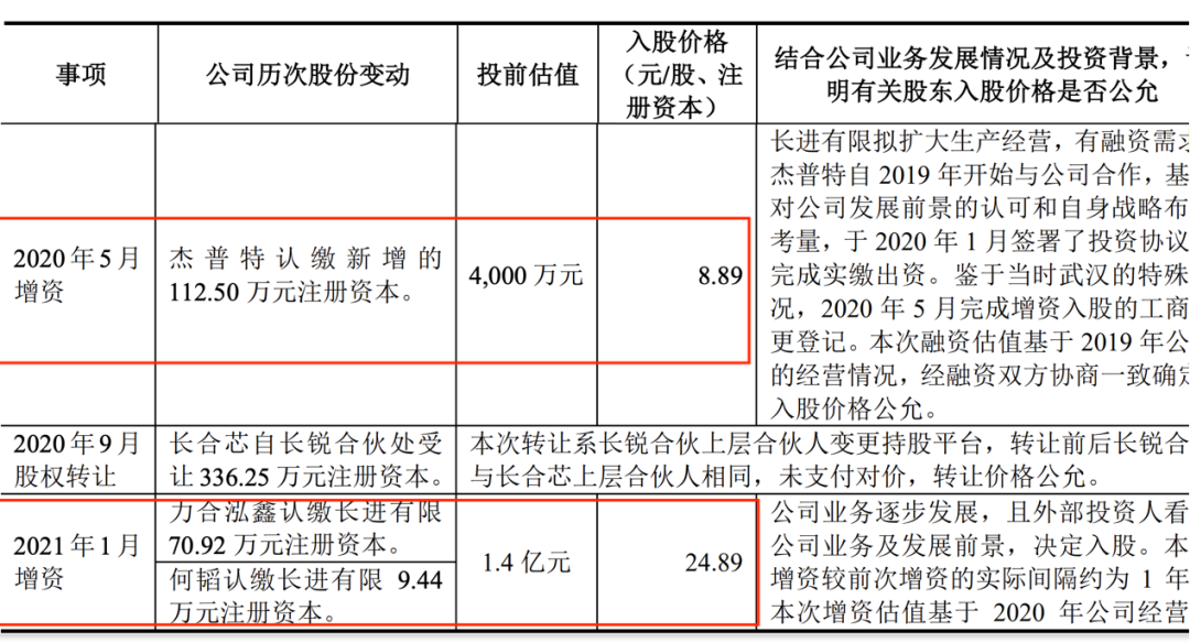 8个月后(2021年1月),长进光子的投前估值已经上涨至1.4亿元,入股价格为24.89元/注册资本。也就是说,短短8个月时间,杰普特所持股票每股浮盈近180%。