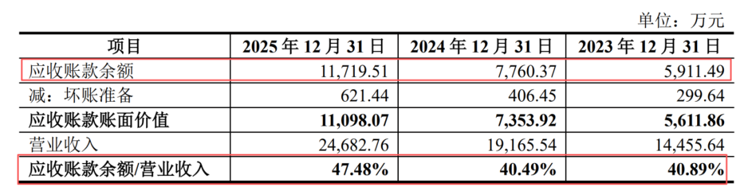 2023年-2025年,长进光子应收账款余额分别为5911.49万元、7760.37万元和1.17亿元,占营业收入的比例分别为40.89%、40.49%和47.48%。也就是说,公司超4成营收都是“纸面富贵”。