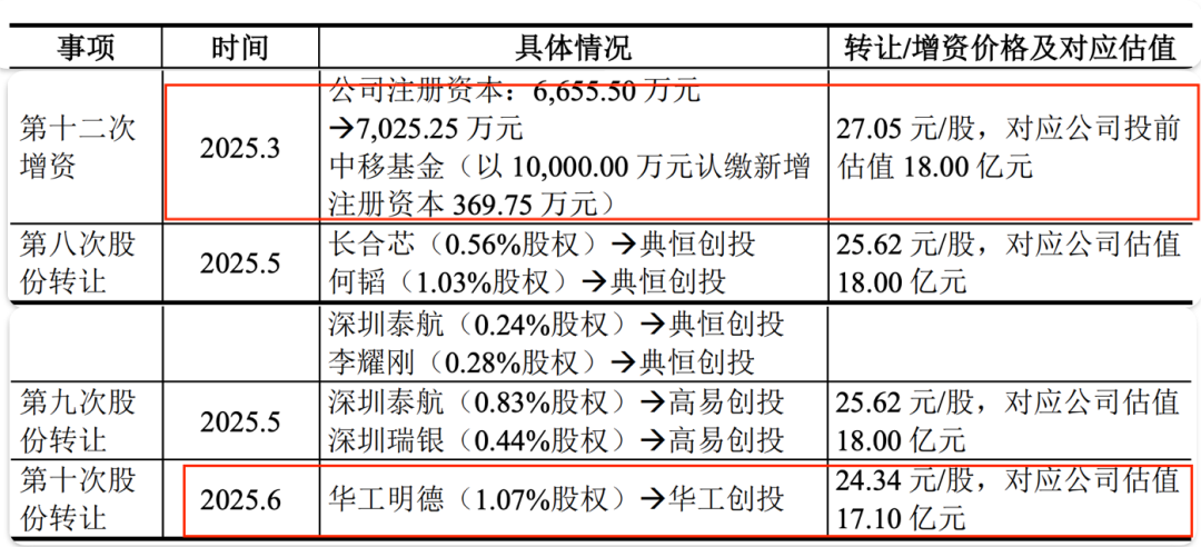 然而,还未上市,长进光子的估值就出现了回落。2025年3月,中移基金以27.05元/股的价格入股,当时公司估值为18亿元。3个月后,华工明德转让公司股权,单价降至24.34元/股,对应估值17.10亿元。