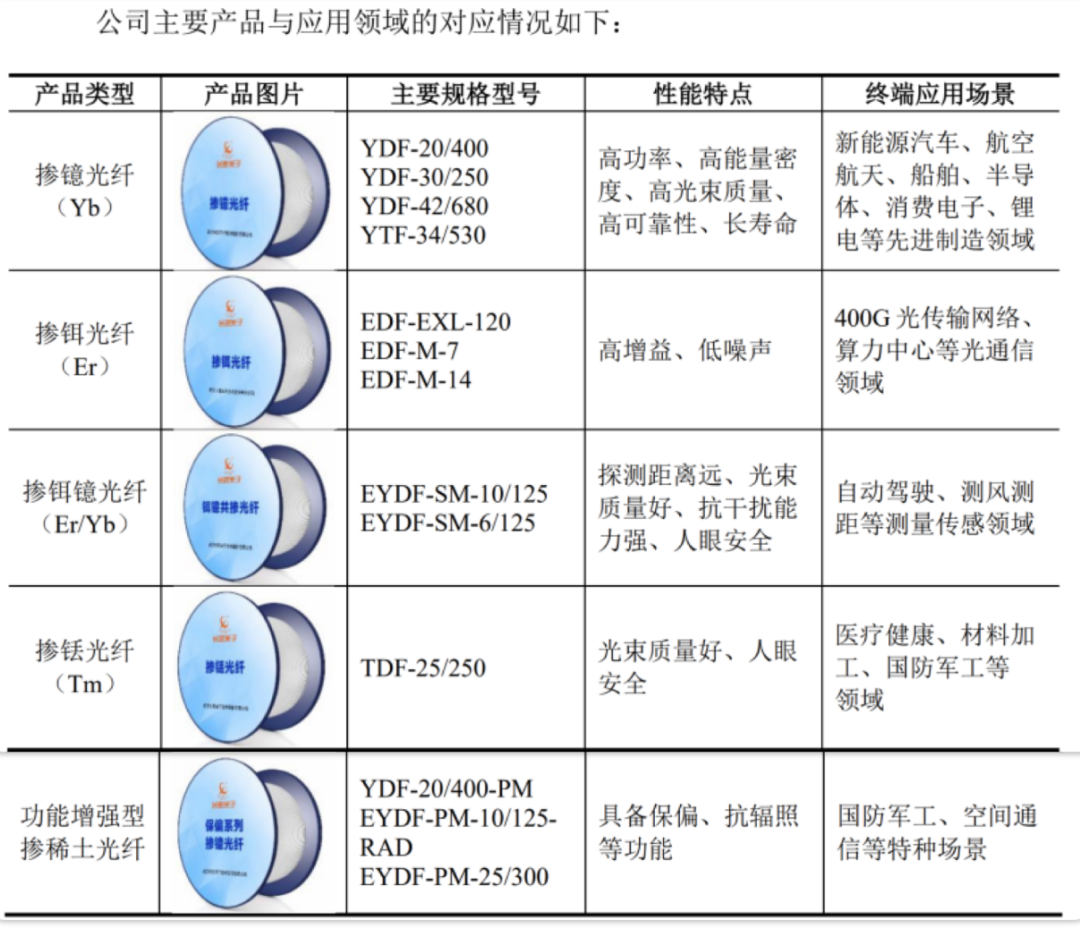 作为特种光纤厂商,长进光子主要生产多品类特种光纤,核心产品是掺稀土光纤。由掺稀土光纤制成的器件,可广泛应用于先进制造、光通信、国防军工等领域。