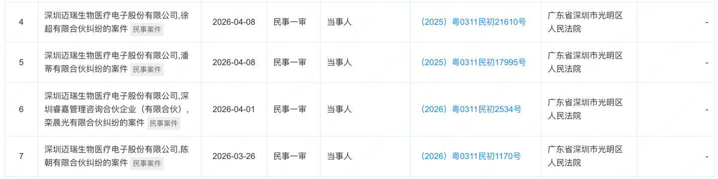 2026年3-4月,迈瑞医疗与涉及四名前核心骨干的有限合伙纠纷进入民事一审阶段,尽管公开信息未披露原被告身份,但结合时间线与股权结构来看,此次纠纷大概率围绕员工持股平台的合伙人权益、退出机制展开。根据迈瑞医疗早前公告,睿和投资与睿嘉管理属于迈瑞医疗的员工持股平台。