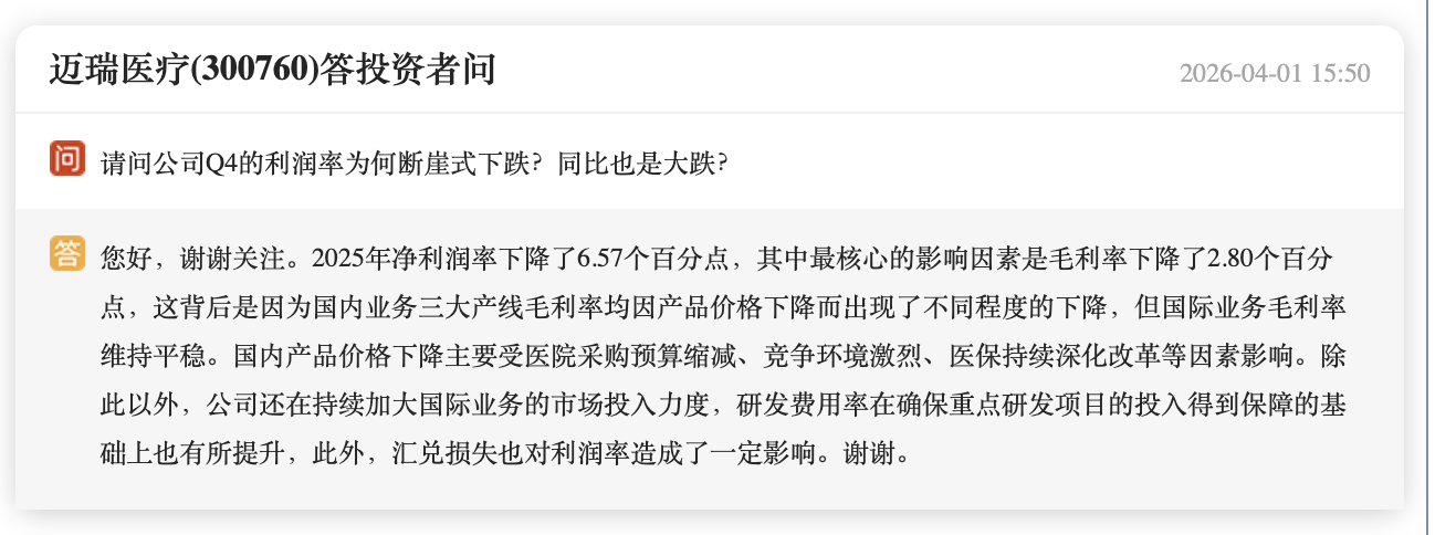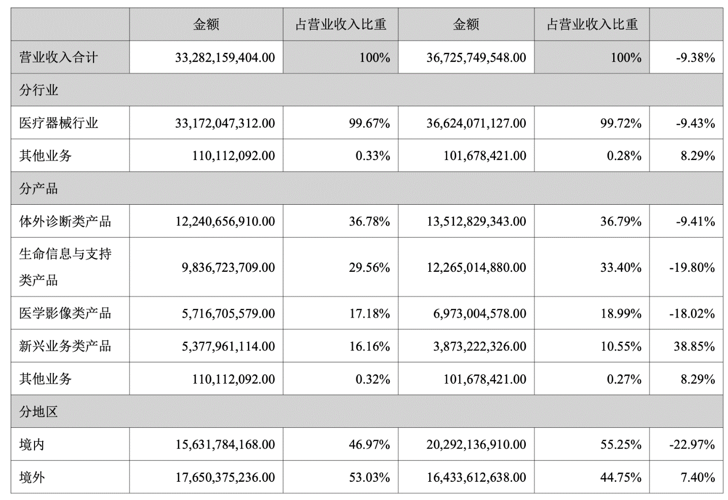 这是迈瑞医疗上市以来首份营收与利润双双下滑的年报,持续多年的高增长就此告一段落。尽管海外业务占比首次突破50%、进口替代的长期逻辑未改,但国内业务明显承压的现实难以回避。