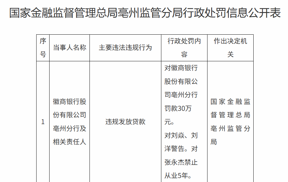 4月9日,国家金融监督管理总局公布行政处罚信息,徽商银行(03698)亳州分行因贷款发放环节存在严重违规,被处以30万元罚款,相关责任人张永杰也被处以5年银行业禁入。