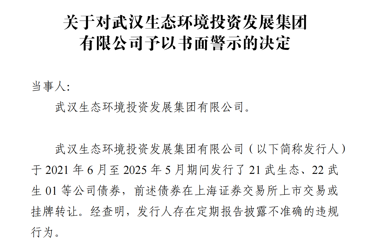 近日,上海证券交易所对武汉生态环境投资发展集团有限公司(下称“武汉生态集团”)出具书面警示决定,指出其定期报告披露不准确,构成信息披露违规。