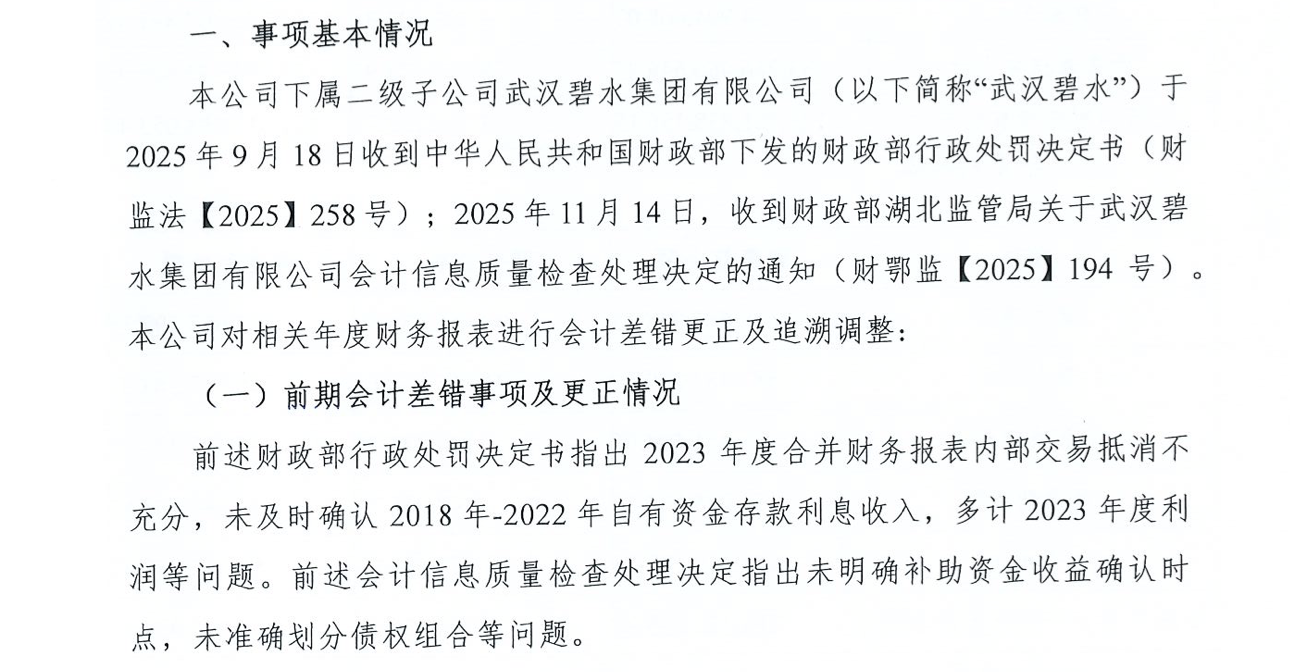 具体来说,2026年2月12日,武汉生态集团发布了《关于前期会计差错更正的公告》,对2021年至2024年四个年度的合并资产负债表和合并利润表进行追溯调整,原因是下属二级子公司武汉碧水集团收到财政部行政处罚决定书及湖北监管局的会计信息质量检查处理通知,涉及内部交易抵消不充分、未及时确认自有资金存款利息收入、补助资金收益确认时点不明等问题。