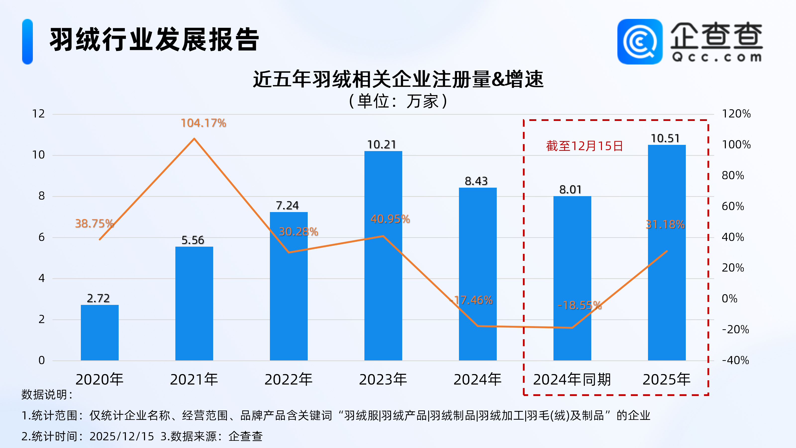 企查查数据显示,截至12月15日,国内现存羽绒相关企业达38.81万家,超7成相关企业归属于批发和零售业,达71.09%,其次为制造业,占比达18.57%。注册量方面,近五年羽绒相关企业每年注册量整体呈上升趋势,截至目前,今年已注册10.51万家相关企业,超去年全年注册水平,较去年同期增长31.18%。