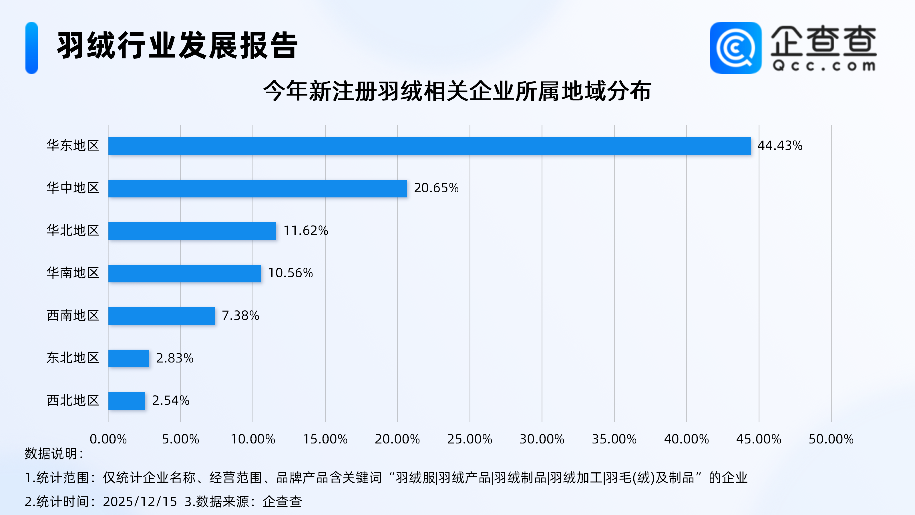企查查数据显示,从地域分布来看,今年新注册的这10.51万家羽绒相关企业中,超4成相关企业分布在华东地区,占比达44.43%,其次为华中地区,占比达20.65%。