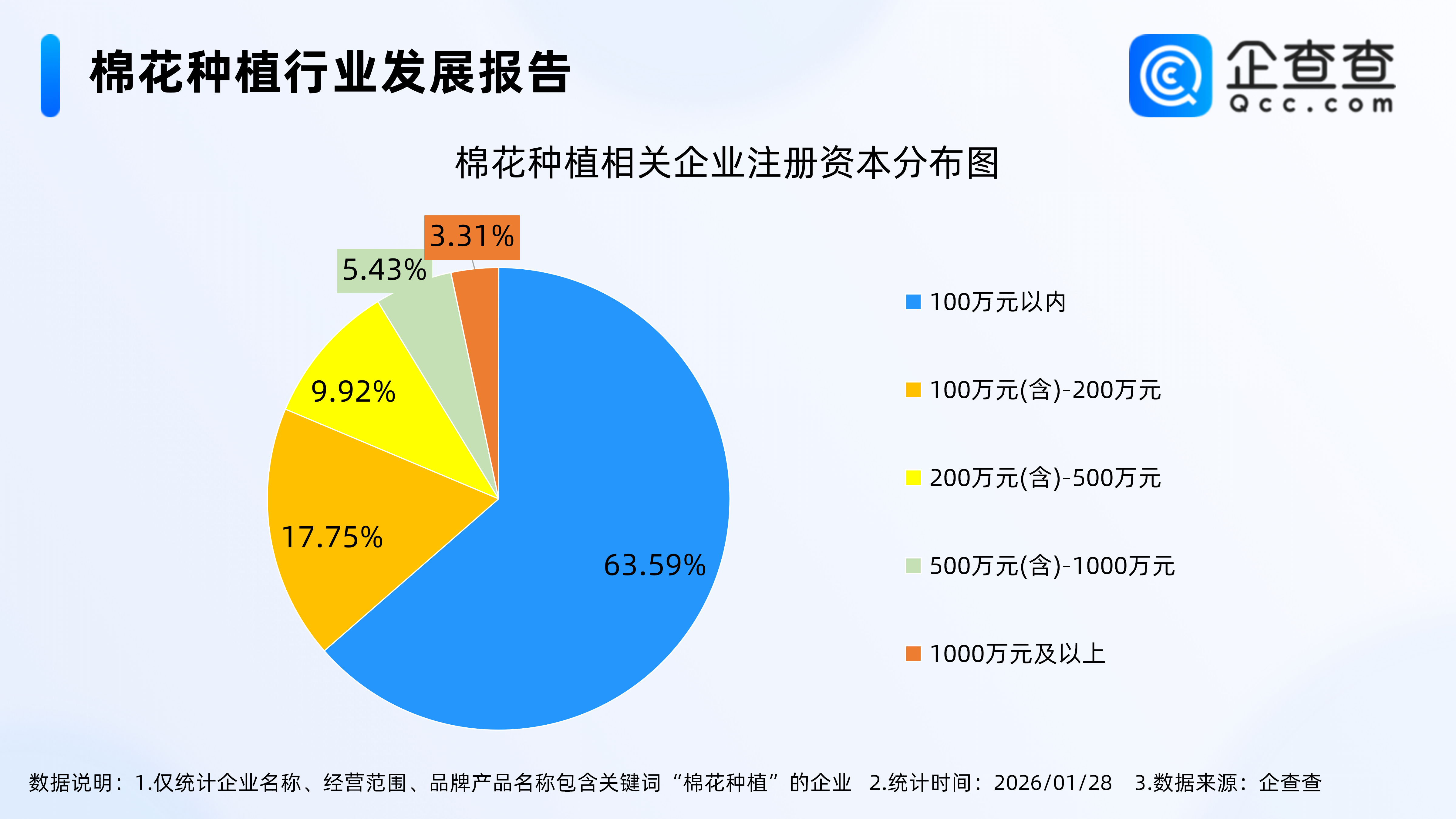 企查查数据显示,从注册资本分布来看,棉花种植相关企业多为轻量级企业,注册资本在100万元以内的相关企业最多,占比达63.59%。其次,注册资本在100万元(含)-200万元的相关企业占比17.75%。此外,注册资本在千万元及以上的相关企业占比合计3.31%。