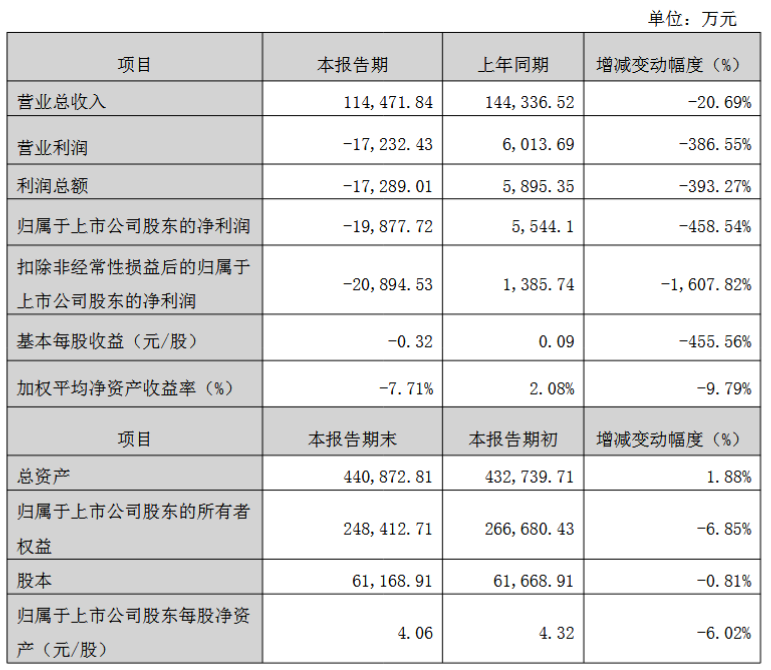 3月6日,万邦德(002082)发布公告,2025年度业绩快报显示,公司营业总收入为11.45亿元,同比下降20.69%;归母净亏损1.99亿元,去年同期则为盈利5544万元。具体数据如下: