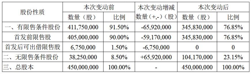 其中,首次公开发行前已发行股份限售的股东共计4名,解除限售股份的数量为5917万股,占公司总股本的13.15%;首次公开发行战略配售股东共计4名,解除限售股份的数量为675万股,占公司总股本的1.50%。