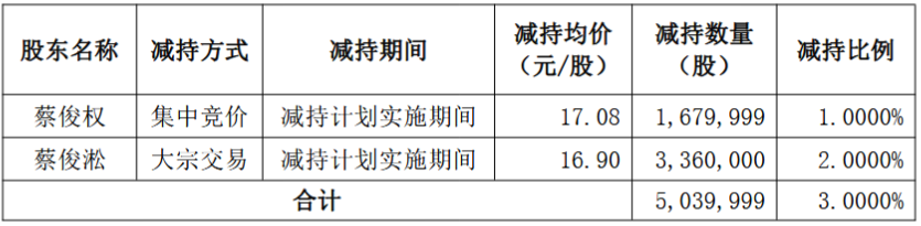 本次减持后,蔡俊权持有公司股份5088万股,占公司总股本的30.2863%;蔡俊淞持有756万股,占公司总股本的4.5010%。