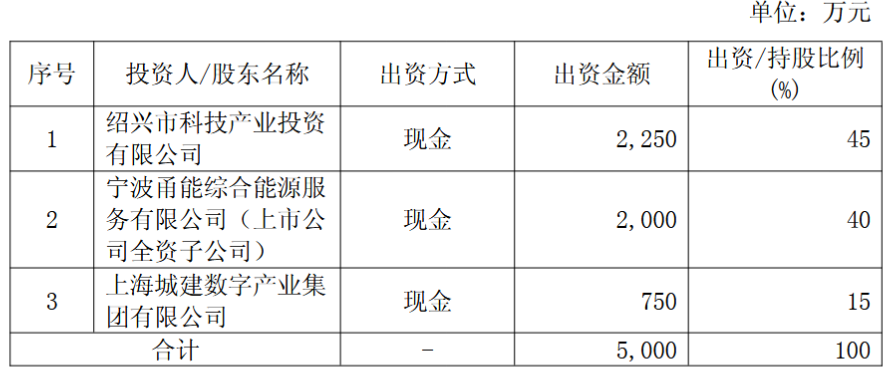 公告指出,绍兴综能注册资本金为5000万元,甬能综能认缴2000万元。投资人/股东投资情况如下: