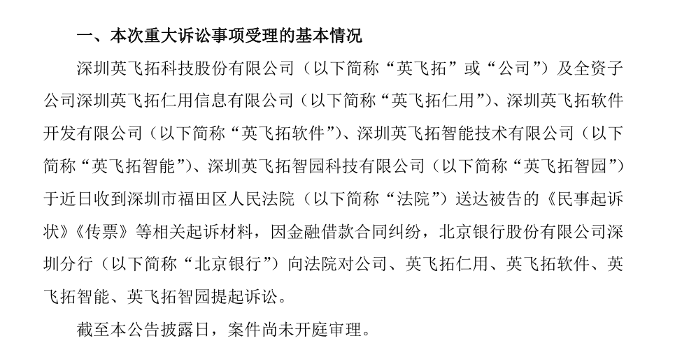 2026年3月24日,ST英飞拓(002528)对外披露重大诉讼公告,公司及四家全资子公司因金融借款合同纠纷,被北京银行(601169)深圳分行诉至深圳市福田区人民法院,涉案本金、利息、罚息、复利及律师费合计4781.6万元。