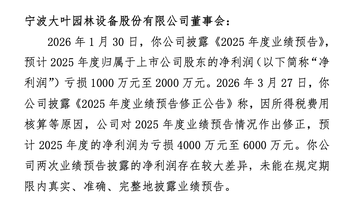 近日,深交所创业板公司管理部向大叶股份(300879)下发监管函,直指该公司2025年度业绩预告信息披露不准确的问题。